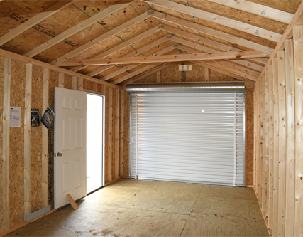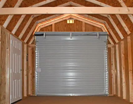 - Roll-up garage door creates a wide, lockable opening for equipment, tools, and larger items
